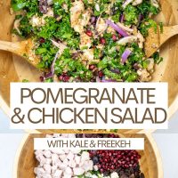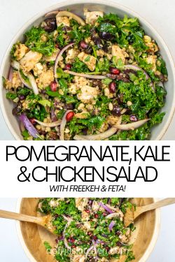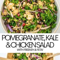 This salad comes together pretty quickly and it’s perfect as a light dinner or hearty lunch. It’s a great way to use some leftover chicken and tossed with crunchy kale, freekeh and zingy pomegranate seeds, it’s fresh and delicious.
